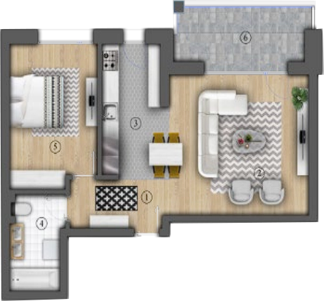 Apartamentul T2 este un spațiu modern și eficient, conceput pentru confortul unei vieți urbane echilibrate. Cu o suprafață utilă de 55,30 mp și o terasă de 8,9 mp, locuința oferă un echilibru între funcționalitate și relaxare.