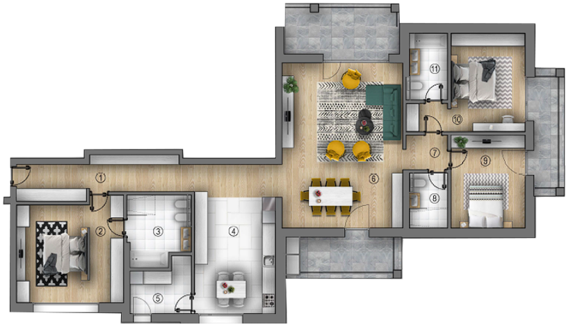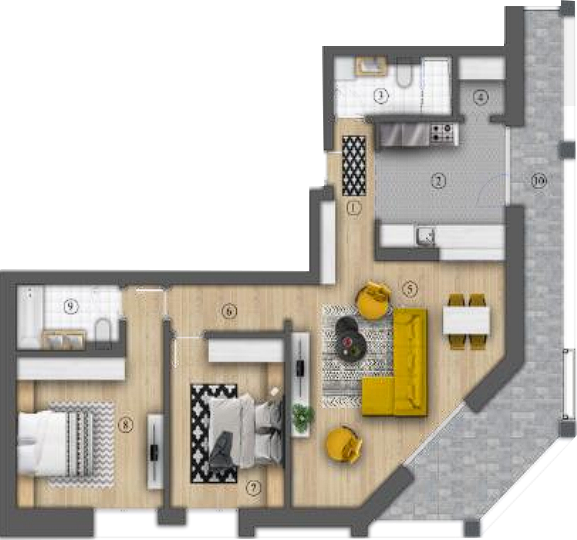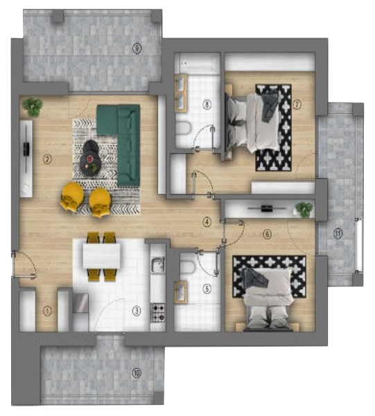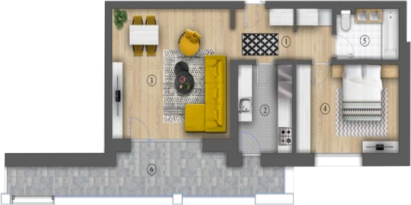 Apartamentul T3 oferă un echilibru ideal între spațiu, confort și funcționalitate. Cu o suprafață utilă de 60,50 mp și o terasă generoasă de 15 mp, este perfect pentru cei care își doresc o locuință luminoasă și bine organizată.
