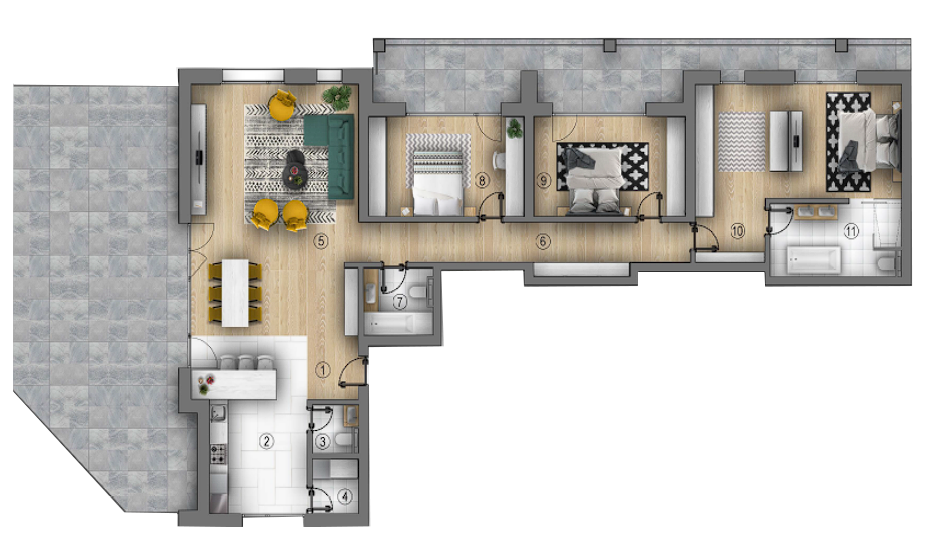 Apartamentul A1 – T6 redefinește ideea de locuință premium. Cu o suprafață utilă impresionantă de 172,3 mp și o terasă panoramică de 88,7 mp, acest penthouse oferă o experiență de locuit la nivelul unui adevărat refugiu urban.