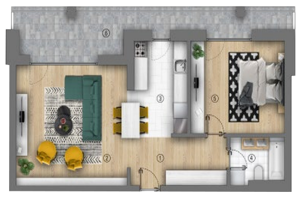 Apartamentul T5 îmbină eleganța și funcționalitatea într-un spațiu de 54,4 mp utili completat de o terasă generoasă de 13,4 mp, ideală pentru relaxare în aer liber.